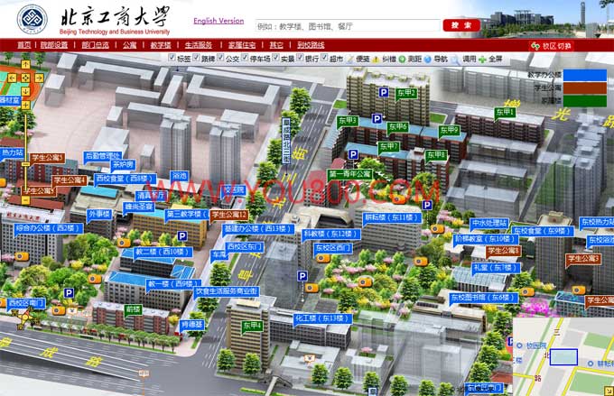 校園地圖系統可將校內的所有機構設置進行導航定位,并提供地圖信息查詢包括機關部處、直屬單位、學院(系),提供單位詳情、電話、導航、本樓其他單位、網站鏈接、樓宇平面圖、全景瀏覽等。